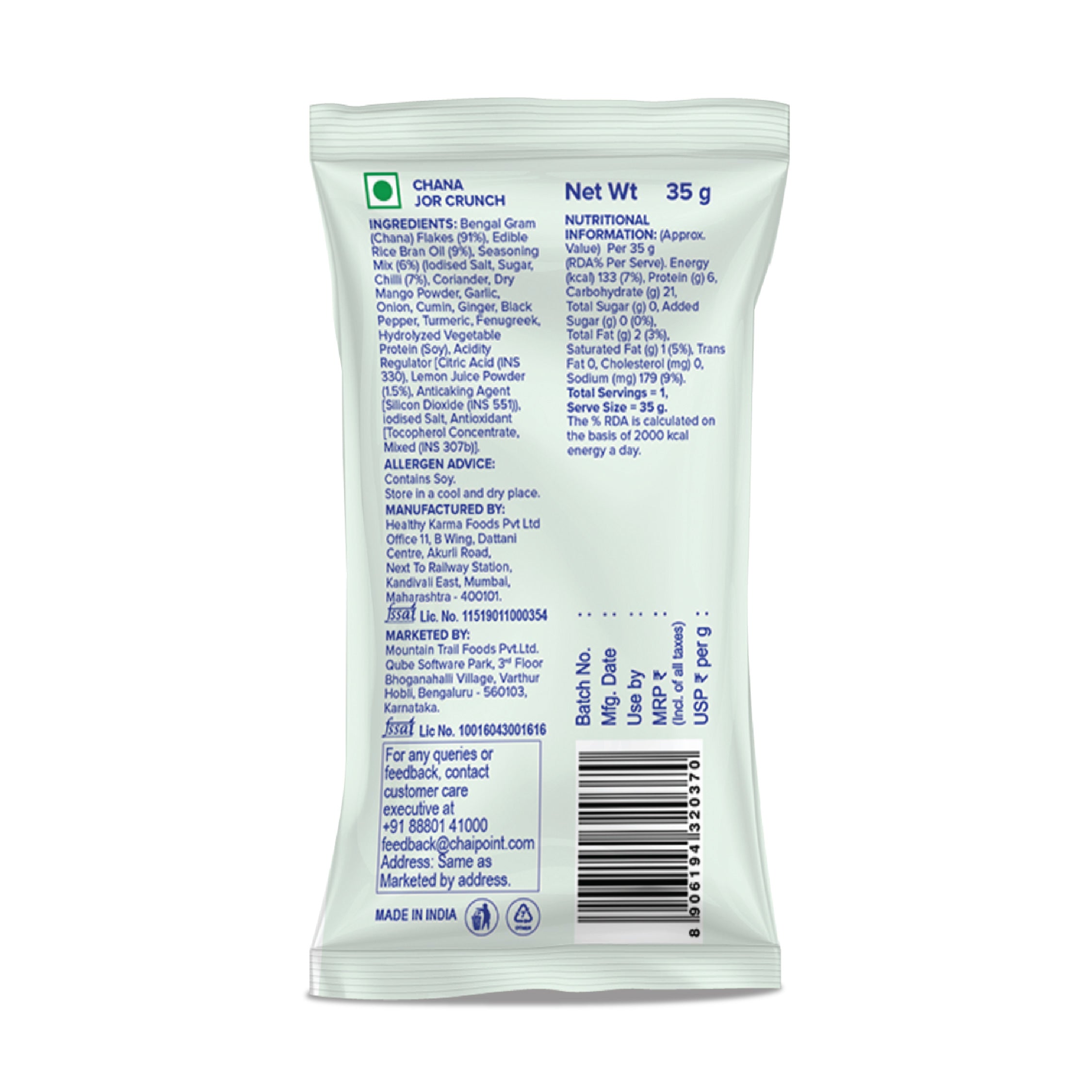 Enjoy a crunchy, flavour-packed snack made specially for chai moments. Chai Point Chana Jor Crunch is made from roasted Bengal gram flakes, seasoned with a balanced blend of Indian spices. Light, crispy, and satisfying—perfect for tea-time, office breaks, or on-the-go munching.